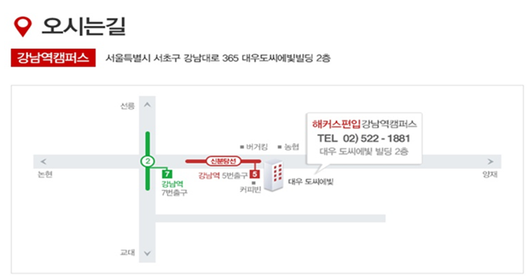 강의일정 | 아침반 : (월~금) 07:00~09:30 오전반 : (월~금) 10:00~12:30 주말반 : (토/일) 09:00~13:10 |