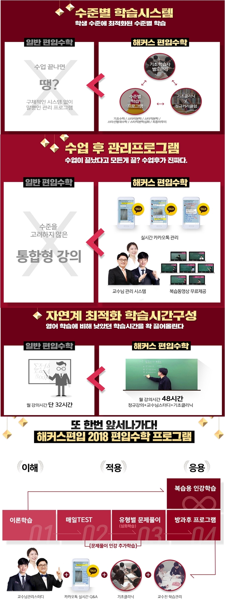 1. 1:1 수학 클리닉 : 수학 교수님의 문제 및 학습 상담 전담 관리 2. 수학 케어프로그램 : 정규 수업 이후, [전 범위]에 걸친 모의고사 및 기출Test 진행 3. 복습동영상 : 정규 수업과 동일한 내용의 복습동영상 100% 지원 4. 수리논술 첨삭 지원 : 수리논술 전형 대학을 위한 홍창의 교수님의 편입수학 첨삭 지도 |