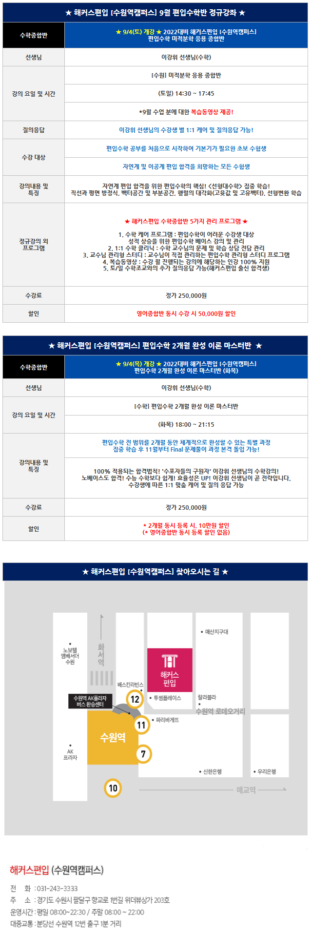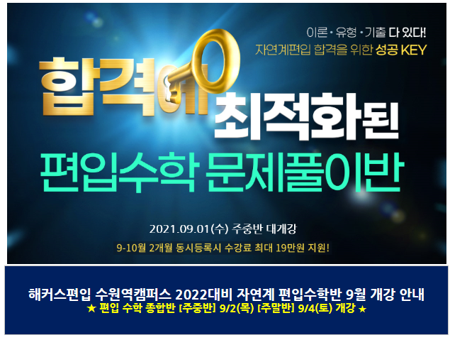 842 ★ 해커스편입 [수원역캠퍼스] 9월 수학종합반 大개강 주중반 9/1(수), 주말반 9/4(토) 개강 ★    2021-08-23