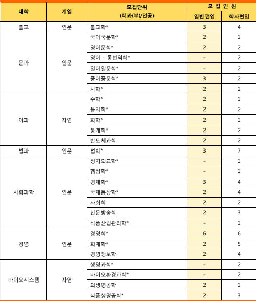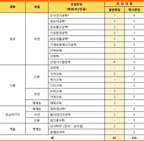 ※ 일반편입: 총 87명 / 학사편입: 총 135명 모집