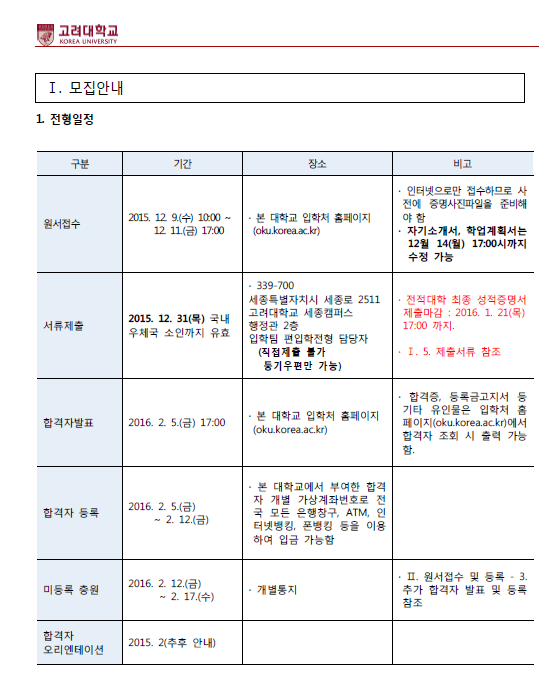2016학년도 고려대학교(세종) 편입학 전형일정 안내드립니다.