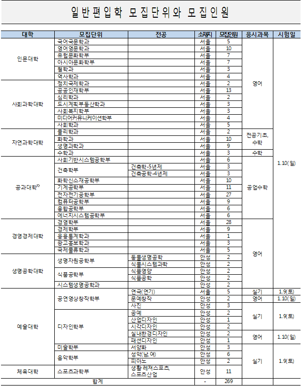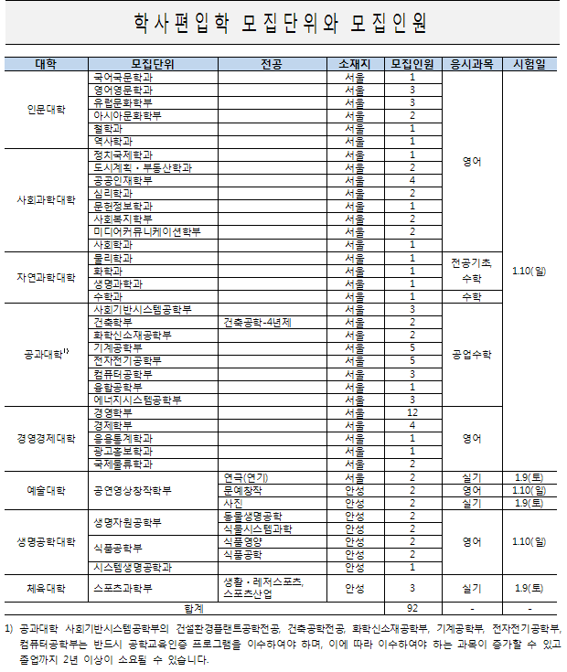 ※ 자세한 편입학 모집요강 내용은 차후 공지되는 편입학 모집요강을 확인하시기 바랍니다.