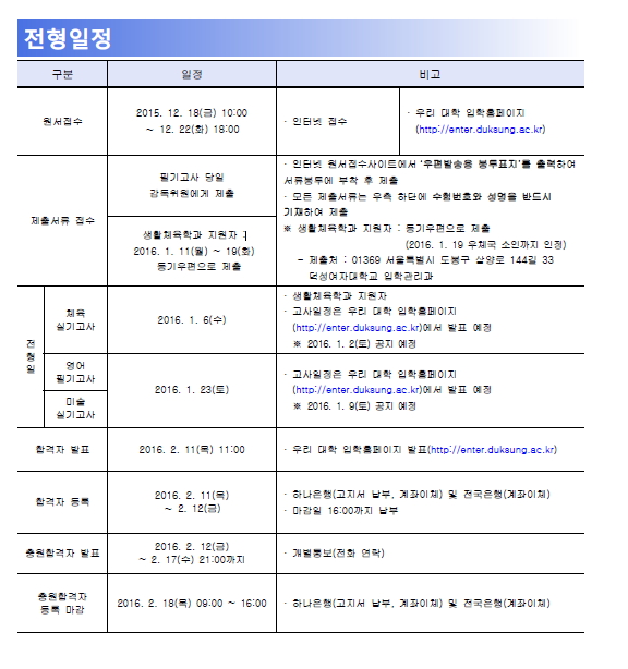 2016학년도 편입학 모집요강은 2015. 12. 15(화) 오전 10시 공지 예정입니다(http://enter.duksung.ac.kr).