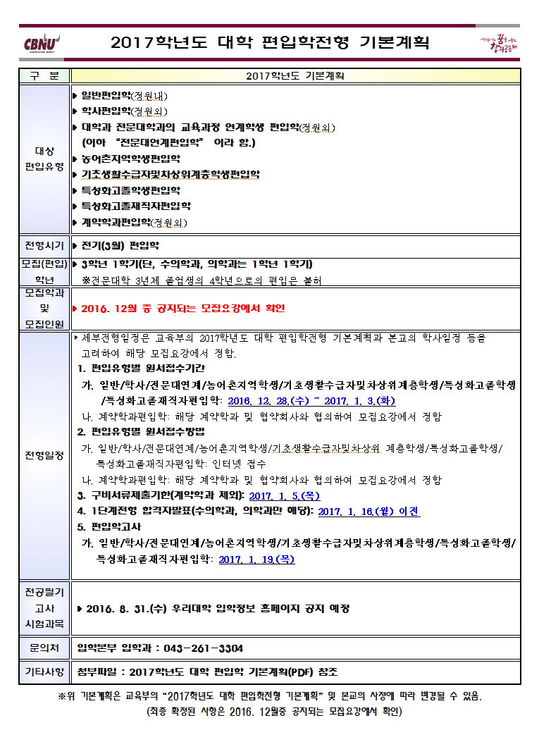 [2017학년도] 충북대학교 편입학 전형계획 안내드립니다.