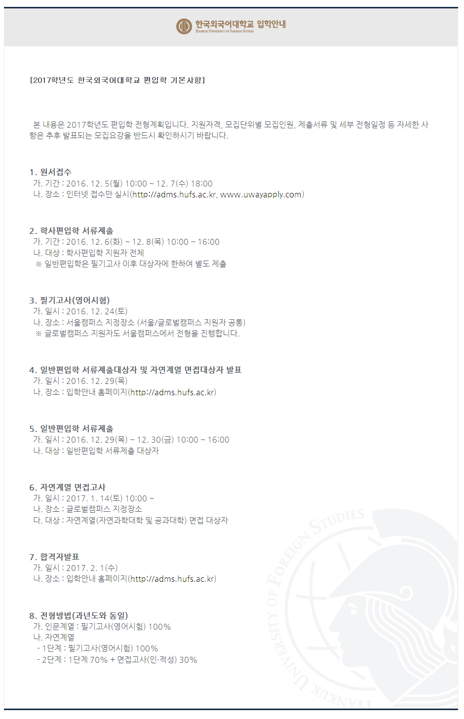 [2017학년도] 한국외국어대학교 편입학 기본안 공지합니다.