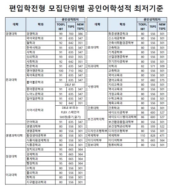 안녕하세요, 해커스편입입니다. 2019학년도 고려대학교 편입학전형 모집단위별 공인어학성적 최저기준 안내입니다.
