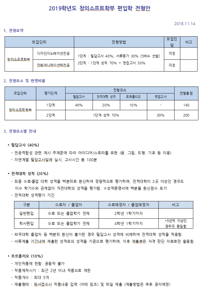 글제목 [2019학년도] 세종대학교 창의소프트학부 편입학 전형