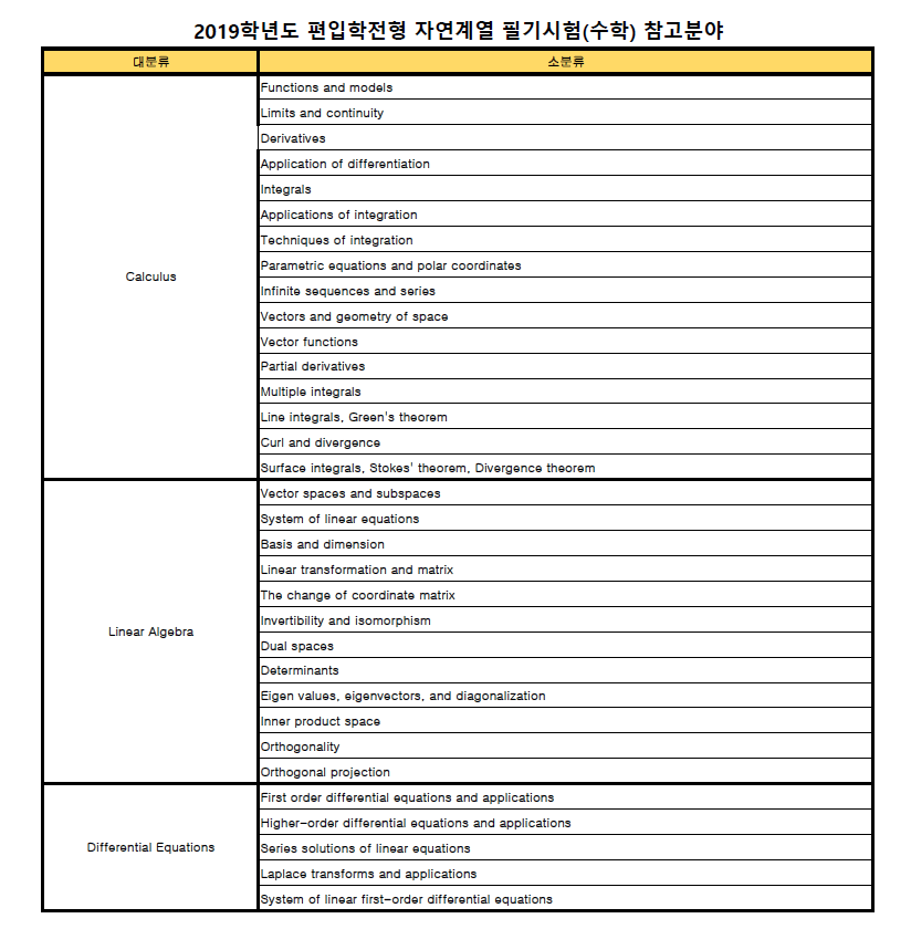 2019학년도 서강대학교 편입학전형 자연계열 필기시험(수학) 참고분야 안내
