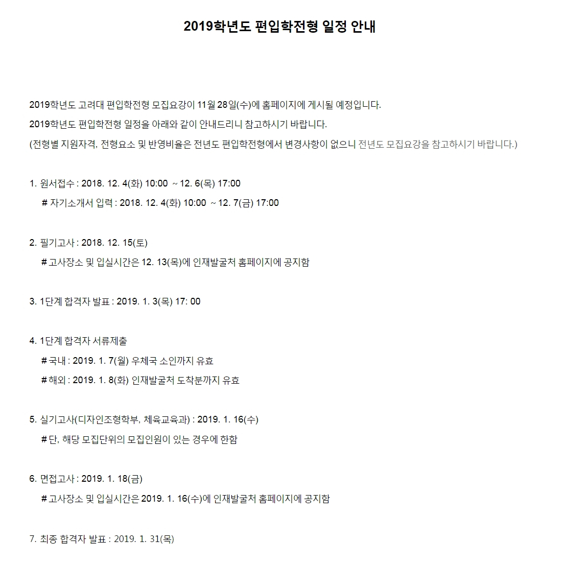 글제목 [2019학년도] 고려대학교 편입학전형 일정안내