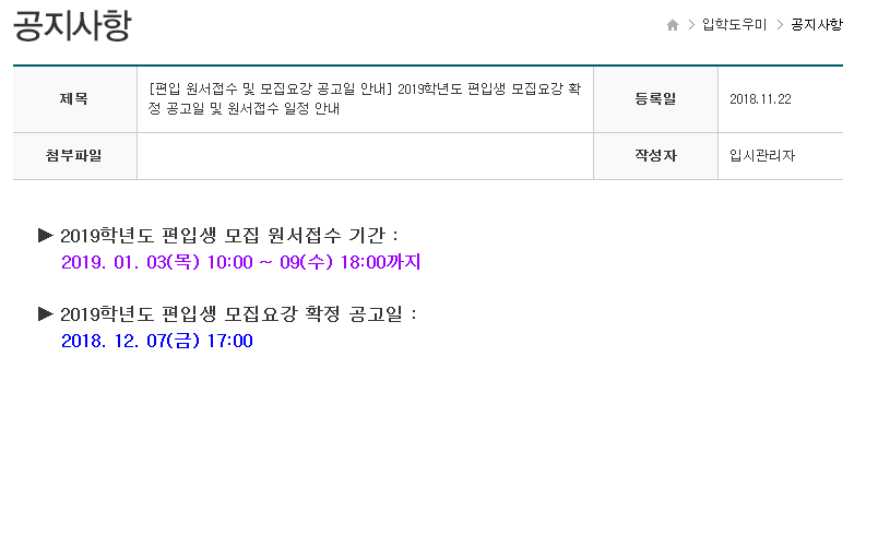 글제목 [2019학년도] 용인대학교 편입학전형 일정입니다.