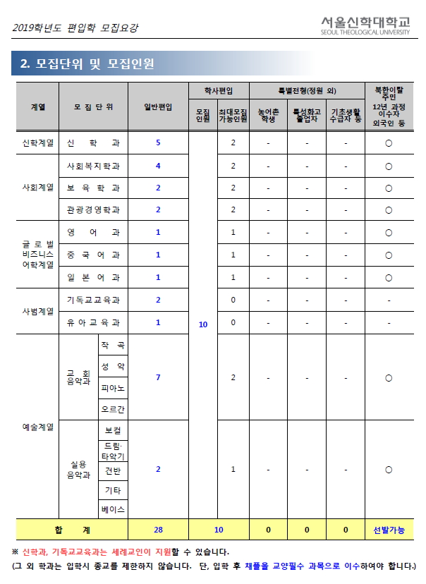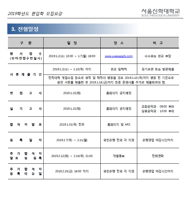 [2019학년도] 서울신학대학교 최종 모집요강 안내