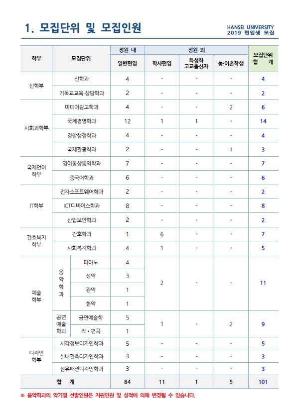 2019학년도 한세대학교 최종 모집요강입니다.