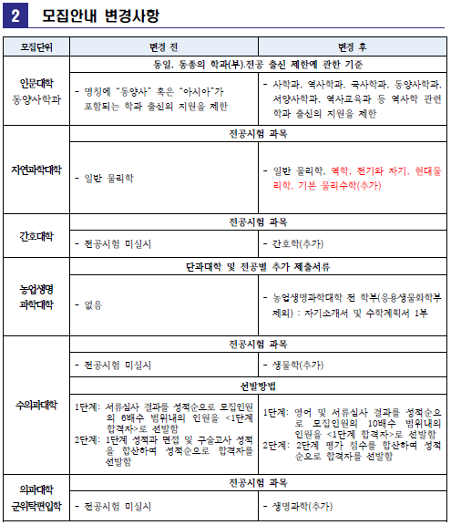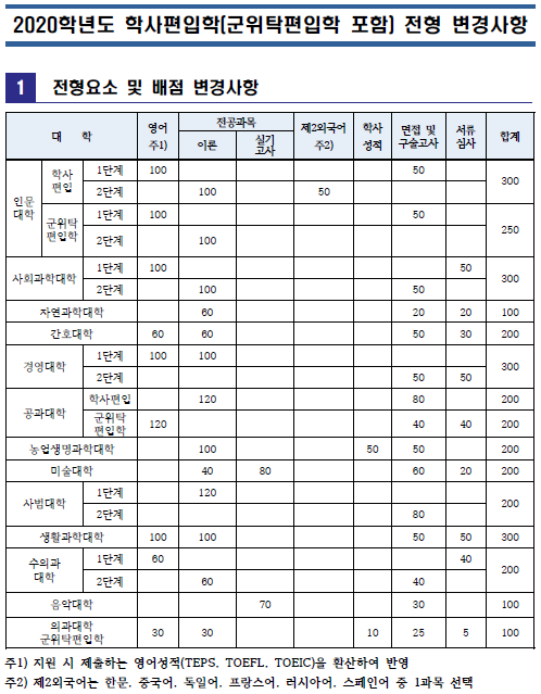 2020학년도 서울대학교 편입학 모집인원 및 변경사항 안내입니다.
