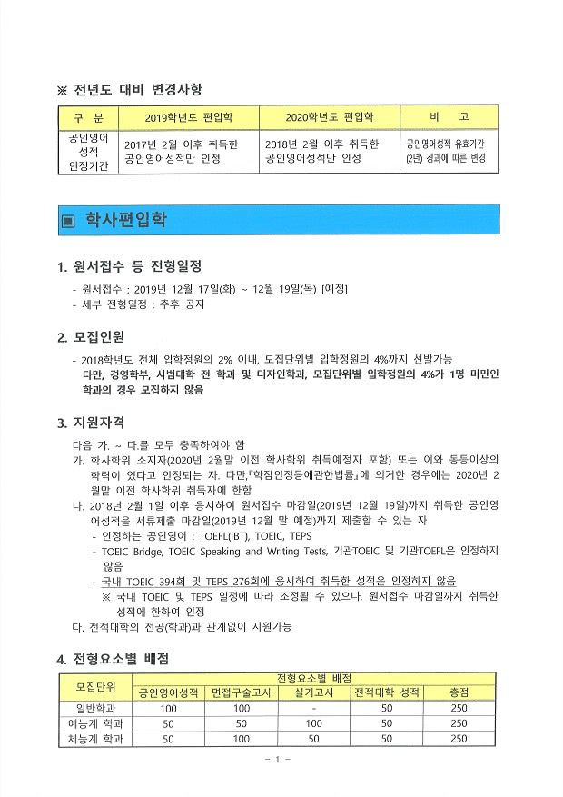 2323 모집요강 [2020학년도] 서울대학교 편입학 모집인원 및 변경사항 안내입니다.    2019-04-18