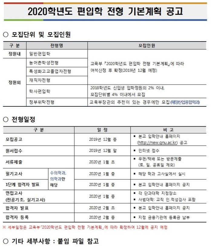 [2020학년도] 경상대학교 2020학년도 편입학전형 기본계획 안내