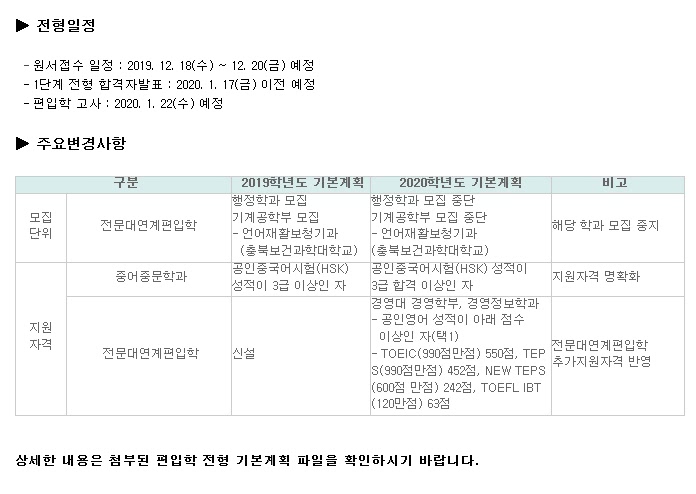 글제목 [2020학년도] 충북대학교 2020학년도 편입학전형 기본계획 안내