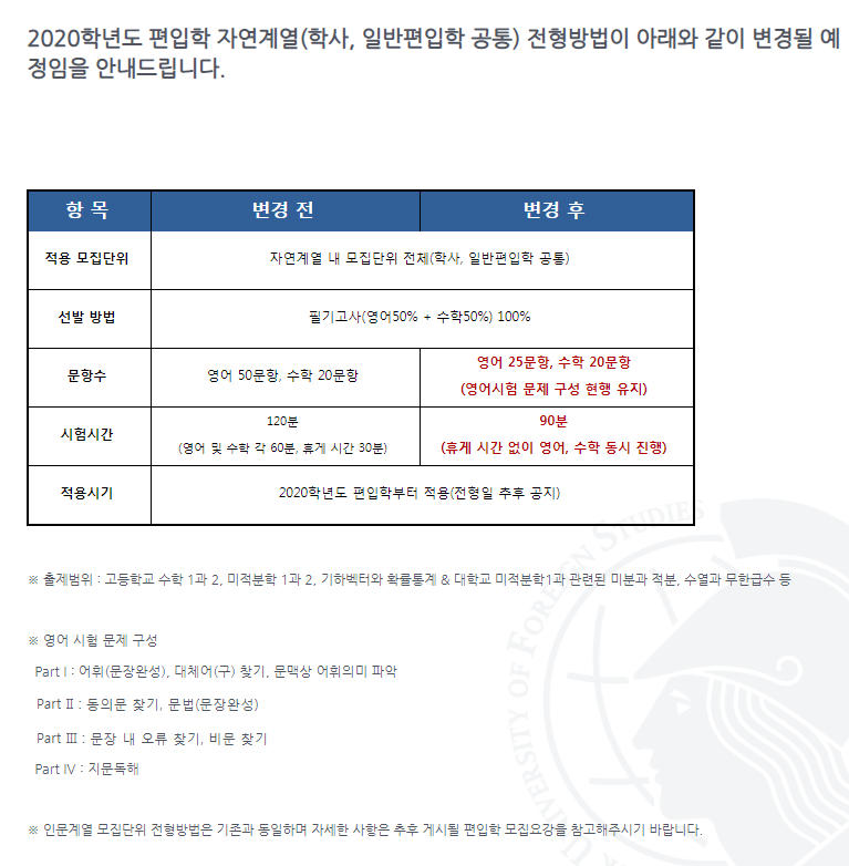 2020학년도 한국외대(글로벌) 편입학 자연계열 전형방법 변경사항 안내드립니다.
