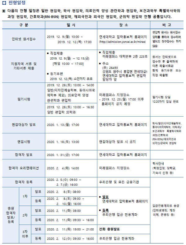 2020학년도 연세대학교(미래) 2020학년도 편입학전형 기본계획 안내 공유드립니다.
