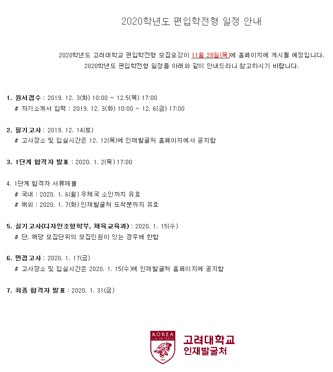 [2020학년도] 2020학년도 고려대 편입학전형 일정 안내