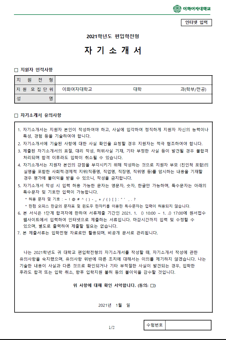 2021학년도 이화여자대학교 편입학 전형 제출서식 (자기소개서, 지원동기 및 학업계획서) 안내해드립니다.