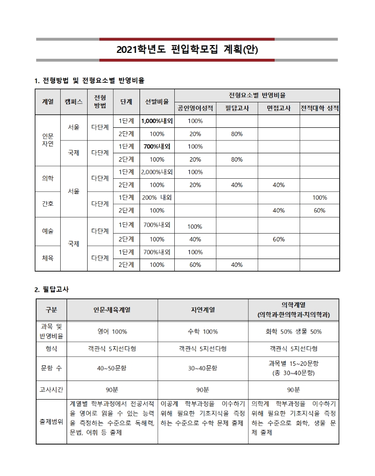 [2021학년도] 경희대학교 편입학 모집 기본계획 안내