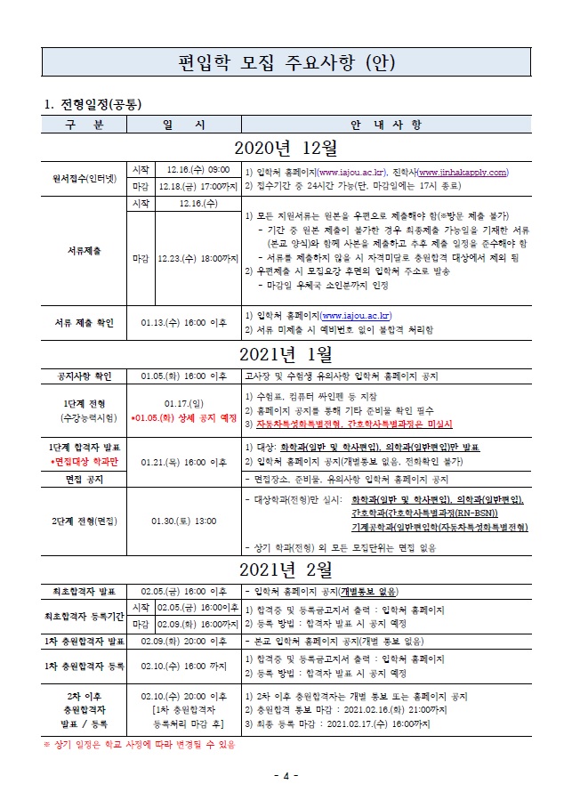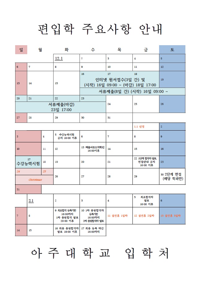 아주대학교 편입학 주요사항 및 일정 안내드립니다.
