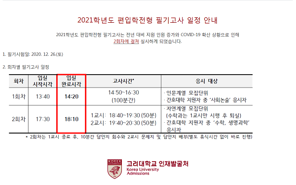 2021학년도 고려대학교 필기시험 일정 변경 안내