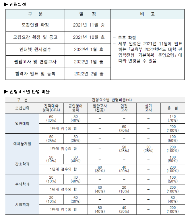 2022학년도 전북대학교 편입학 기본계획 안내입니다.