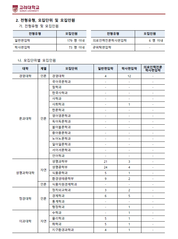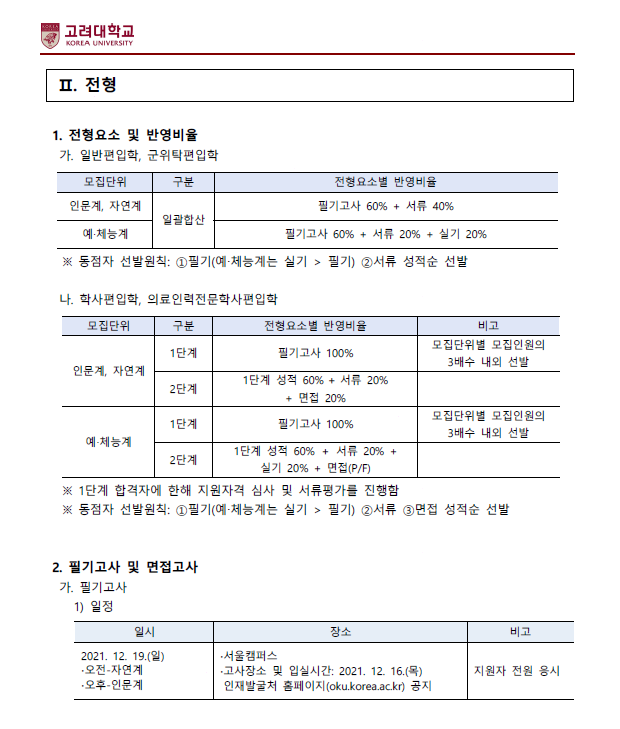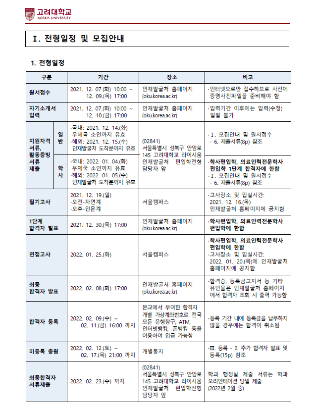 [2022학년도] 고려대학교 편입학 모집요강