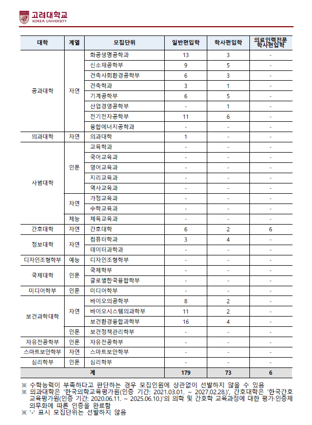 2022학년도 고려대학교 편입학