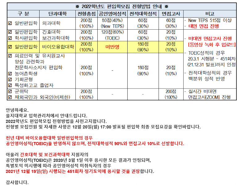 [2022학년도] 을지대학교 편입학모집 전형방법 사전안내