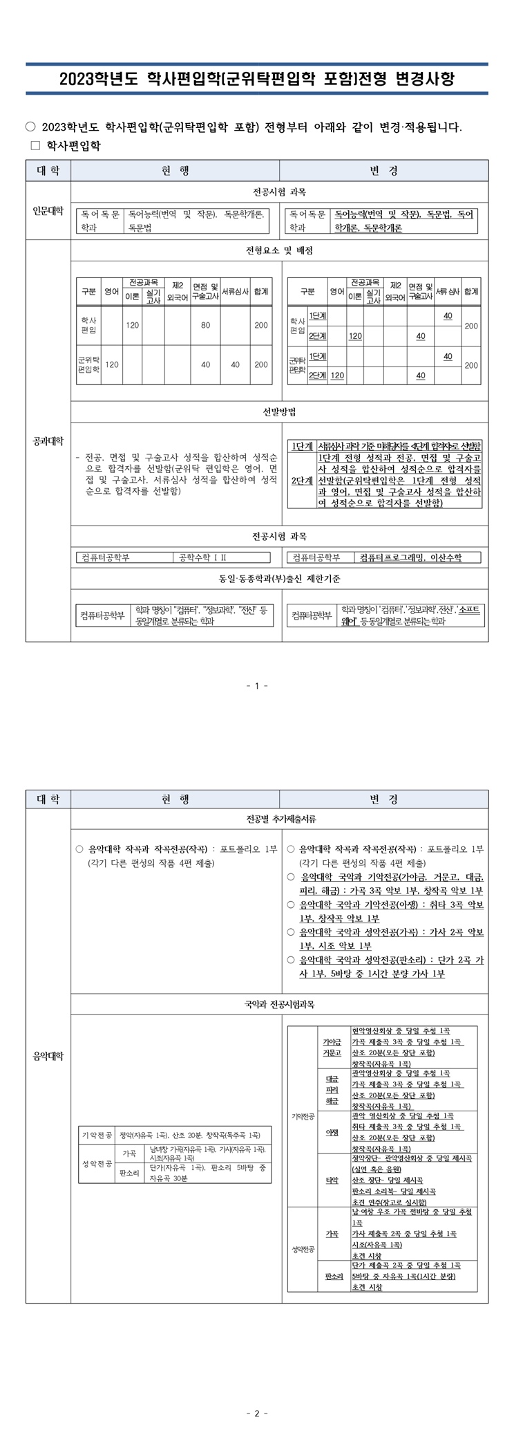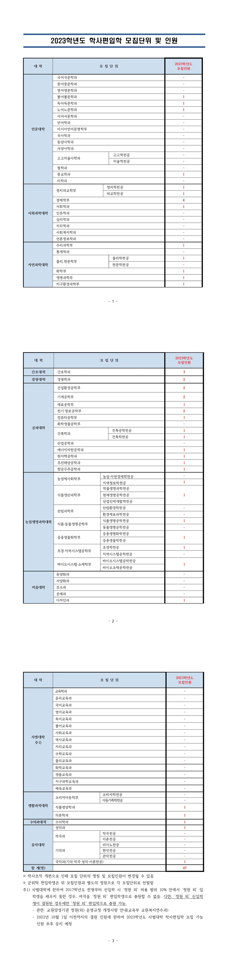 2023학년도 서울대학교 학사편입학(군위탁편입학 포함)전형 모집인원 및 변경사항 안내드립니다.