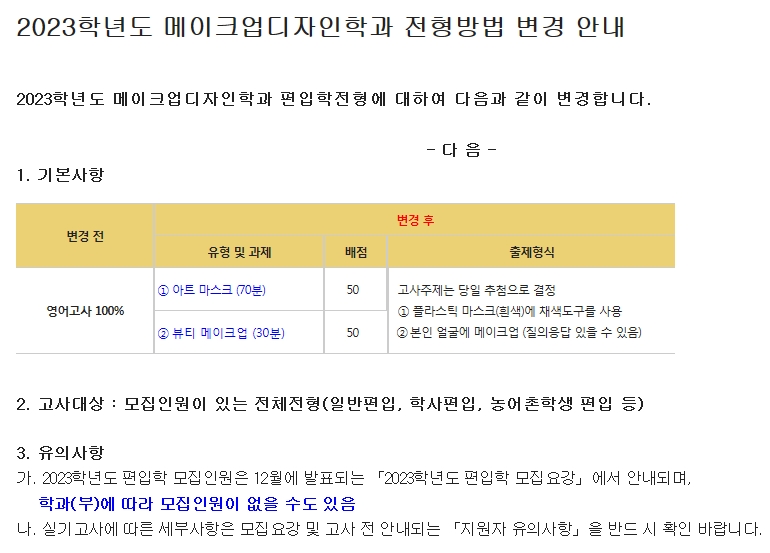 [2023학년도] 서경대학교 메이크업디자인학과 편입학 전형 변경사항