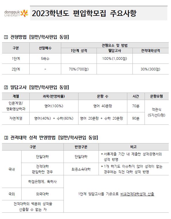 2023학년도 동국대학교 편입학모집 기본계획 안내드립니다.