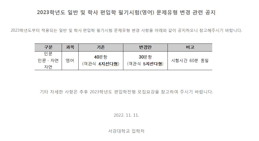 2023학년도 서강대학교 편입학 필기시험 문제 유형 변경 관련 공지 안내드립니다.