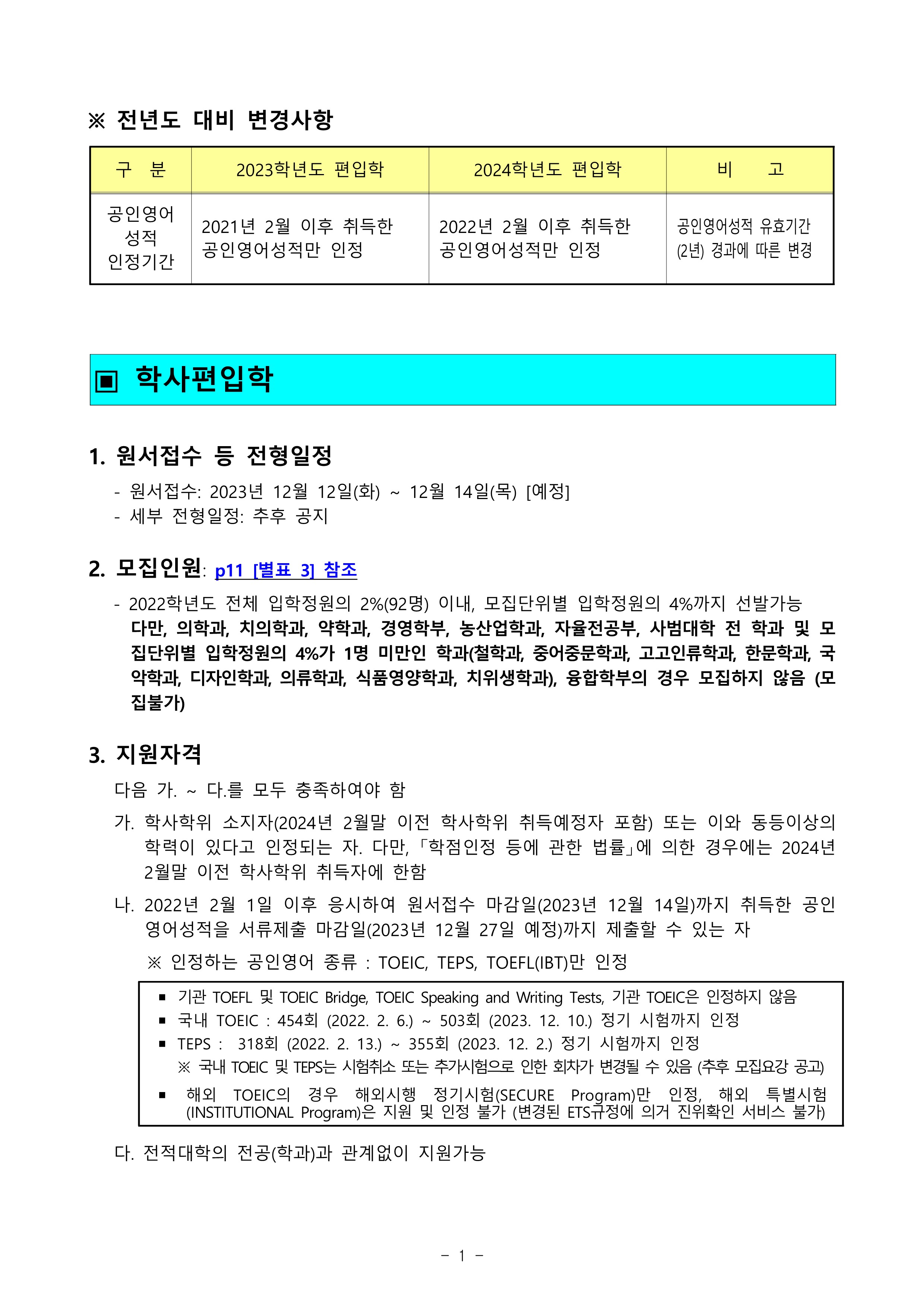 [2024학년도] 전북대학교 편입학 모집 기본계획