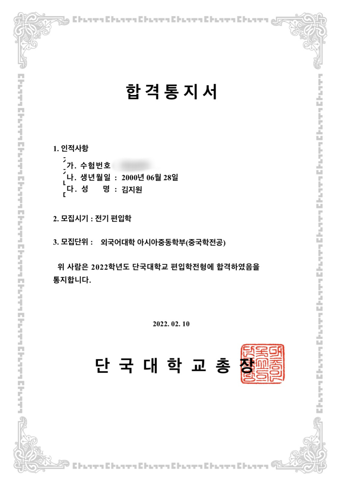 | 최종등록대학/학과 | 단국대학교/중국어과 |