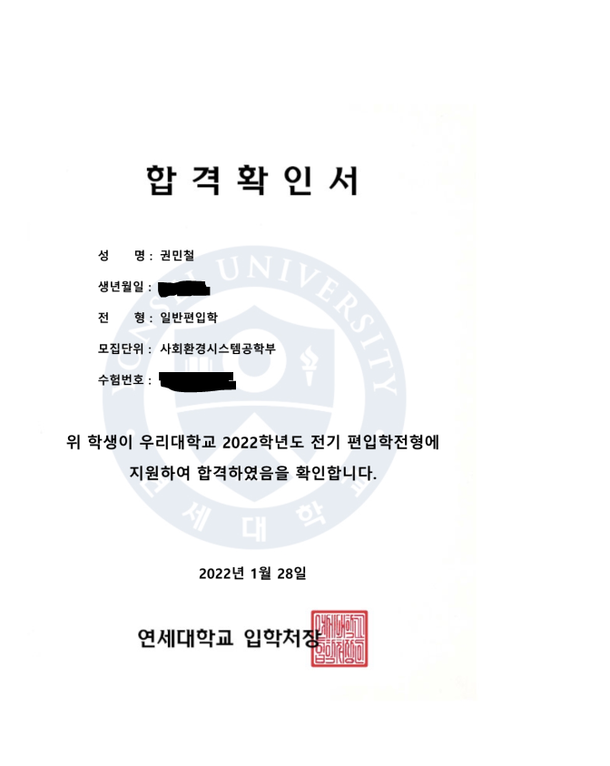 고려대학교 / 바이오의공학부 (수학 -2, 물리 -1) 연세대학교 / 사회환경시스템공학부 (가채점X) 최초합 |
