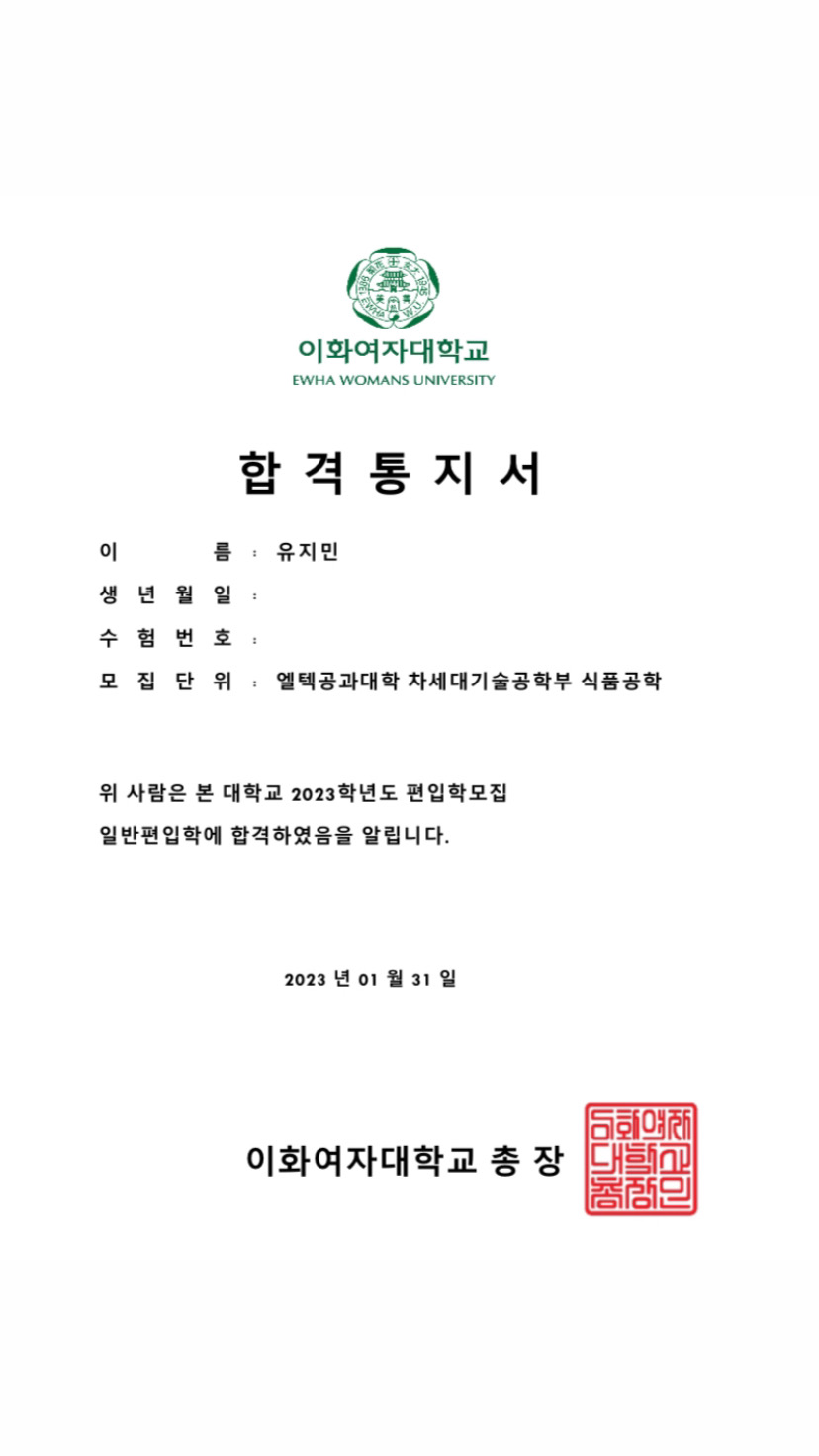 생각지도 못한 대학교에 합격해서 아직도 실감이 안나지만, 앞으로의 대학생활이 기대가 됩니다! 편입준비 힘드실텐데 파이널 때만이라도 빠짝 긴장하고 공부하면 좋은 결과 받을 수 있는 것 같아요! 하기 나름이니까 끝까지 포기하지 않으셨으면 좋겠습니다. |