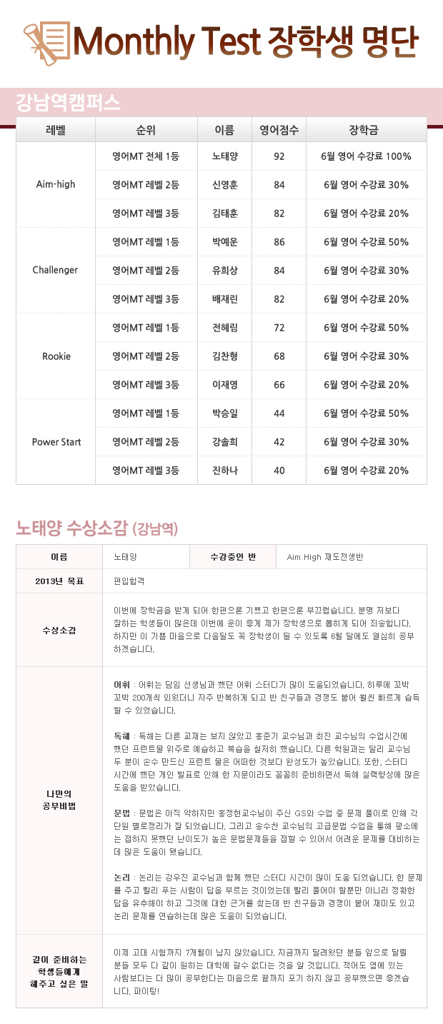 글제목 2012년 5월 강남역캠퍼스 MT(월말고사) 장학생 명단