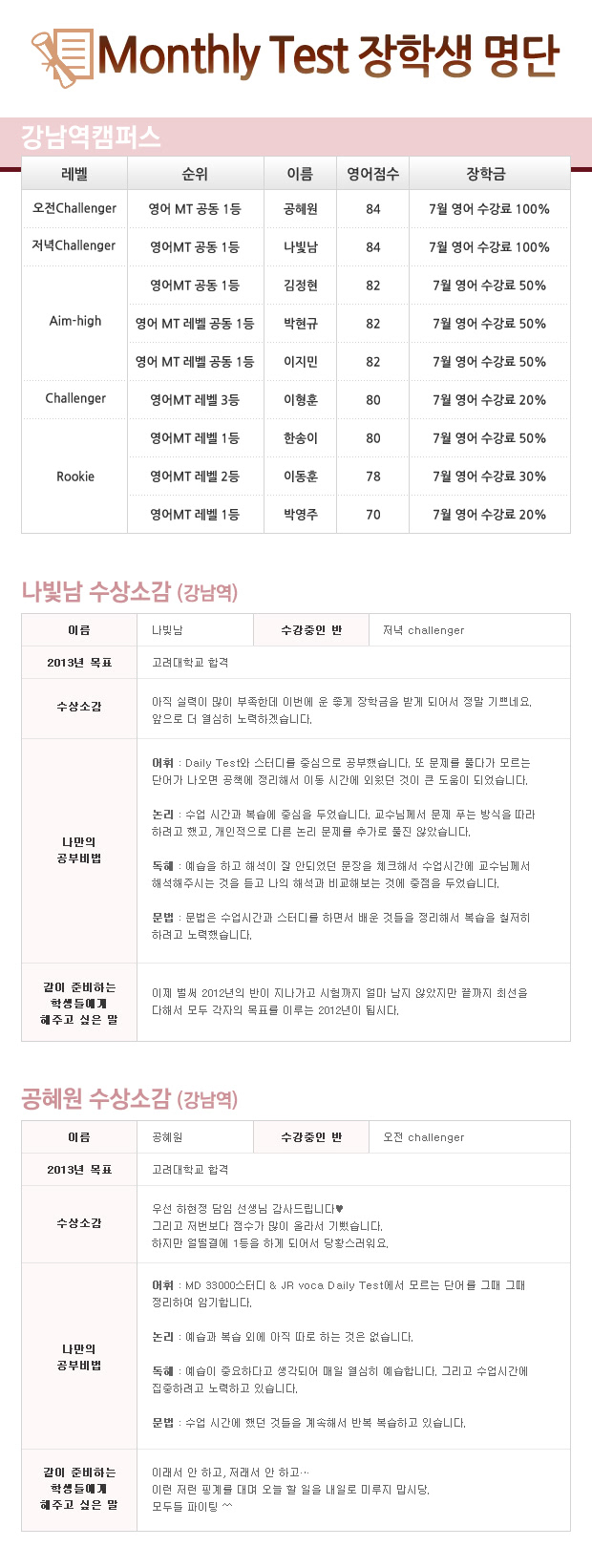 글제목 2012년 6월 강남역캠퍼스 MT(월말고사) 장학생 명단