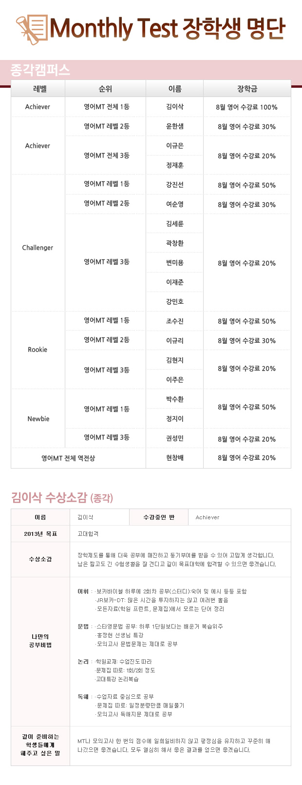 글제목 2012년 7월 종각캠퍼스 MT(월말고사) 장학생 명단