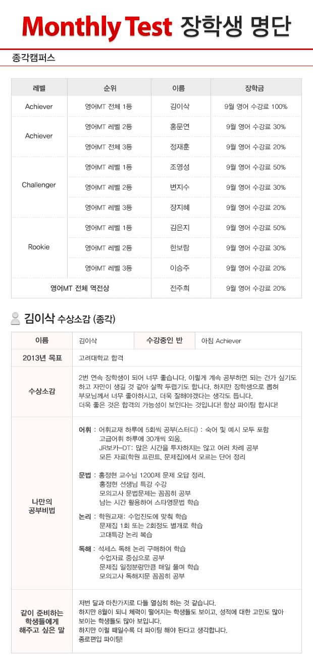 글제목 2012년 8월 종각캠퍼스 MT(월말고사) 장학생 명단