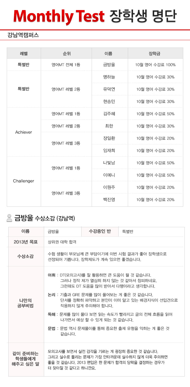 글제목 2012년 9월 강남역캠퍼스 MT(월말고사) 장학생 명단