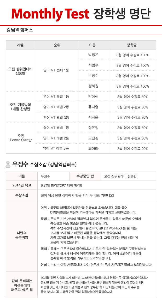 글제목 2013년 2월 강남역캠퍼스 MT(월말고사) 장학생 명단