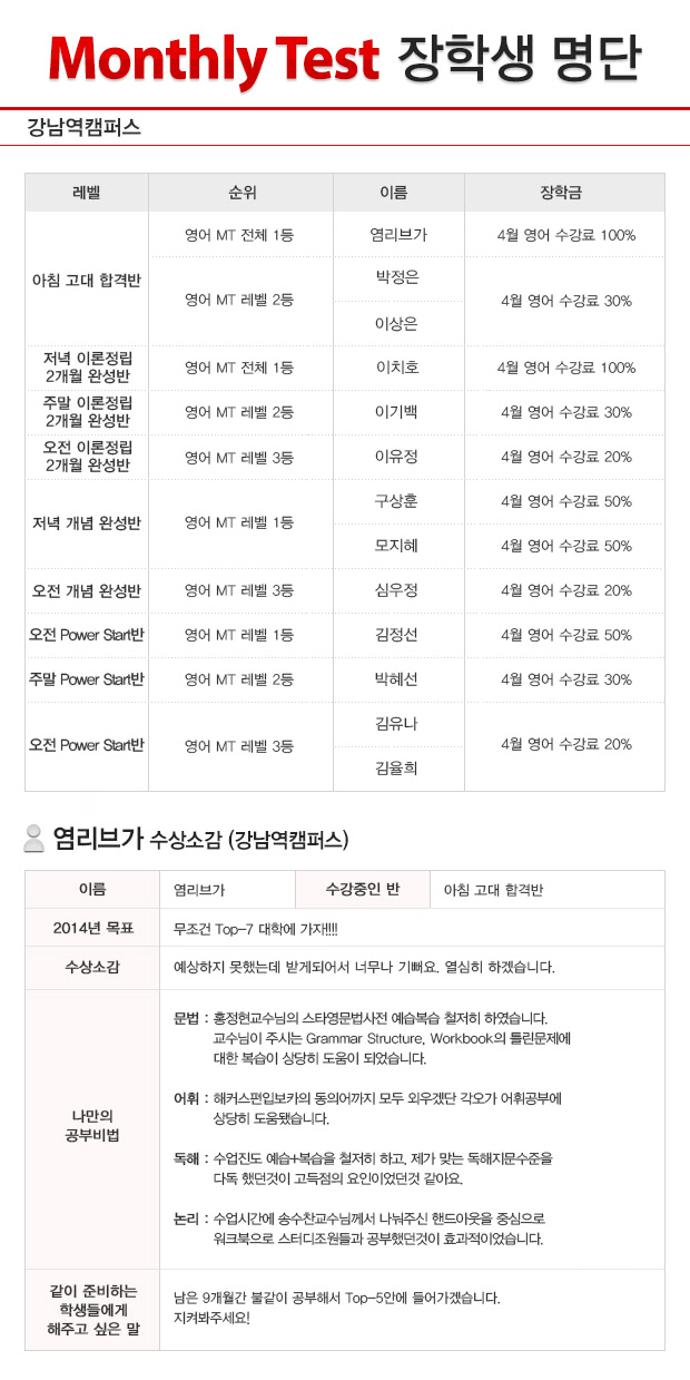 글제목 2013년 3월 강남역캠퍼스 MT(월말고사) 장학생 명단