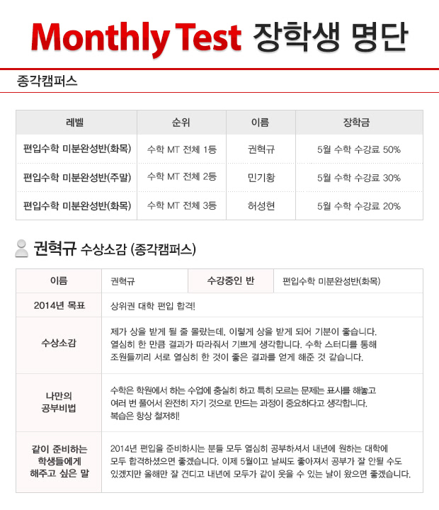 글제목 2013년 4월 종각캠퍼스 MT(월말고사-수학) 장학생 명단