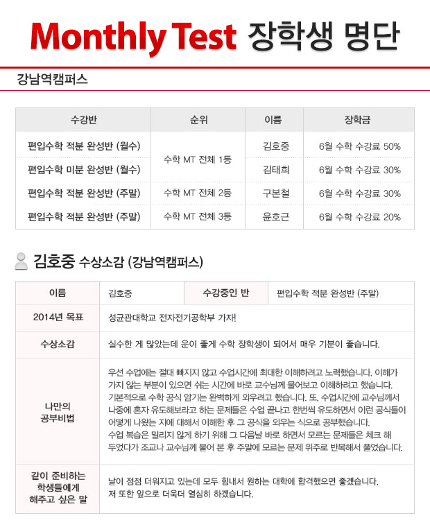 글제목 2013년 5월 강남역캠퍼스 MT(월말고사-수학) 장학생 명단