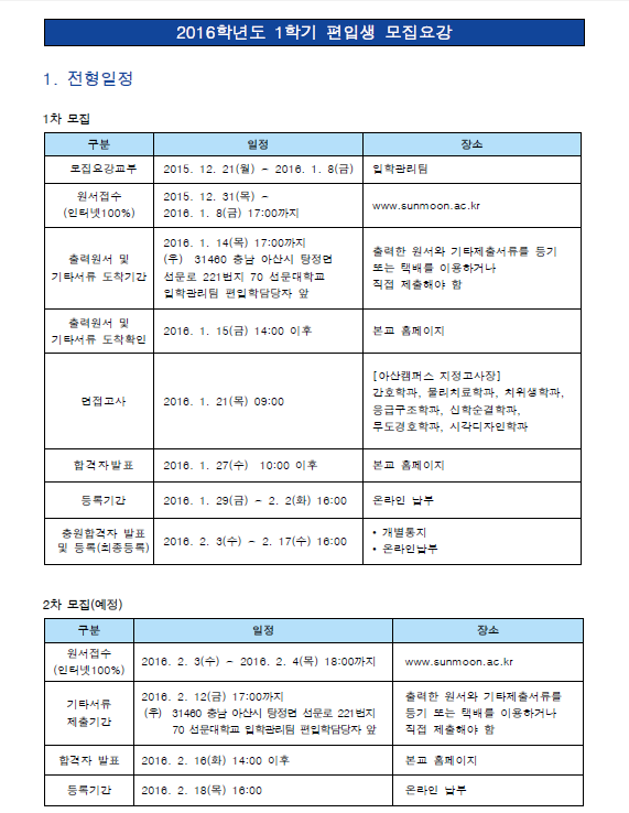 2016학년도 선문대학교 최종 모집요강 안내드립니다.