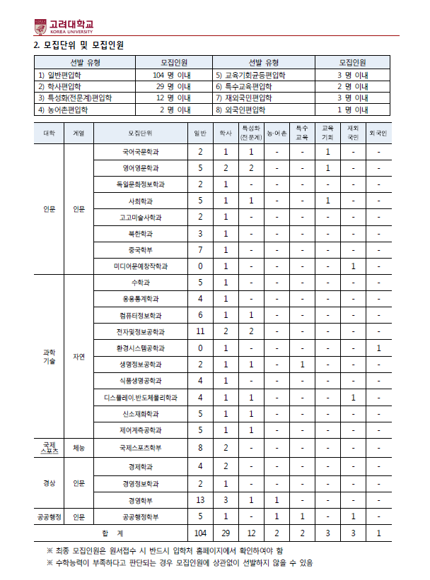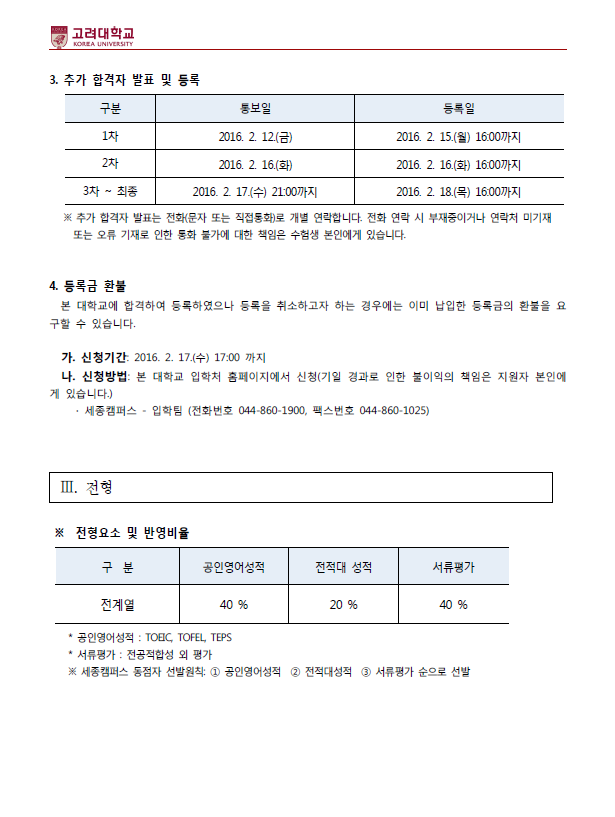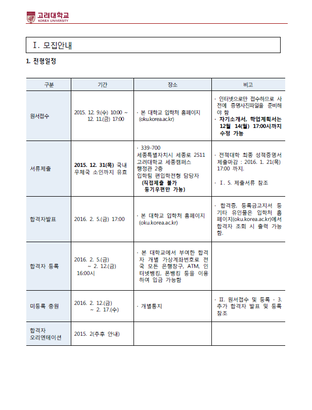 2016학년도 고려대학교(세종) 최종 모집요강 안내드립니다.